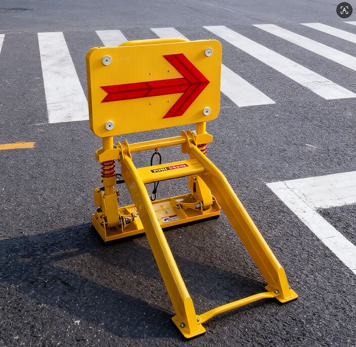 R : Une barrière anti-collision jaune pliable et à roues pour les zones de travail, conçue pour arrêter les véhicules qui entrent accidentellement.
